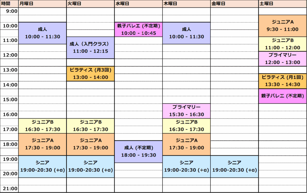レッスンのタイムスケジュールは以下となります。日曜日はお休みです。